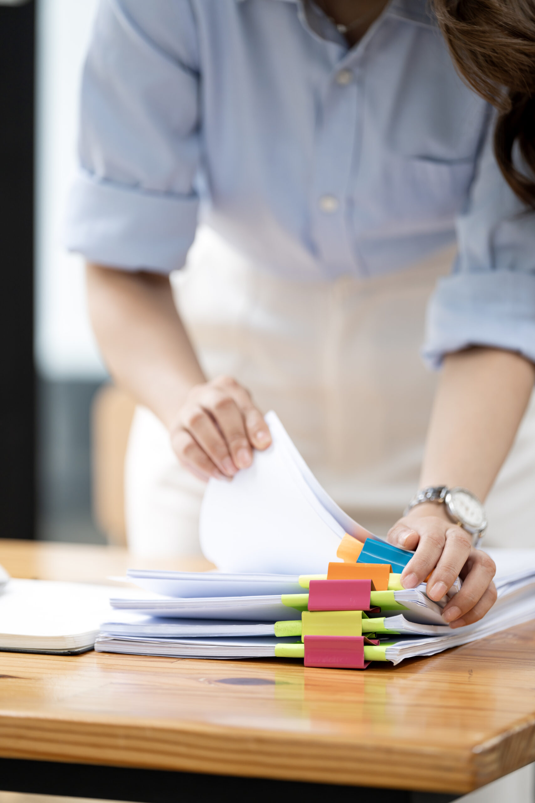 Businesswoman hands working in Stacks of paper files for searchi